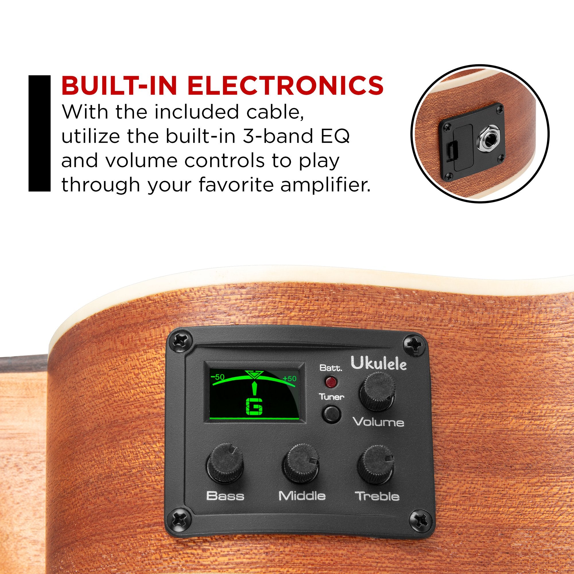 ALL-INCLUSIVE SET: Includes a gig bag, ukulele strap, picks, extra strings, a digital clip-on tuner, and a 1/4-inch amplifier cord (amplifier not included) so you have everything you need to practice and perform