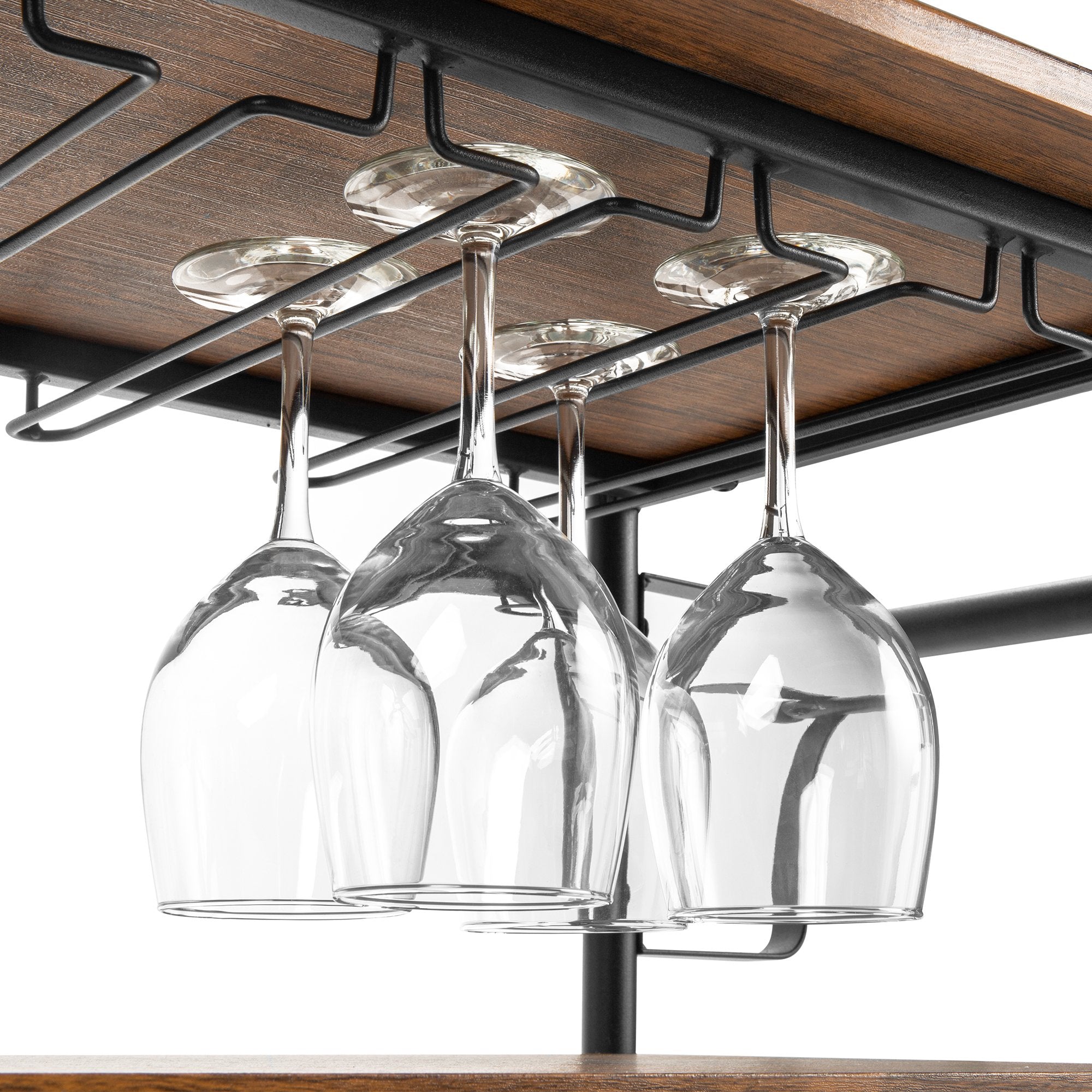 DEDICATED STORAGE SPACE: Features specialized storage racks for glasses on the first shelf, a bottle rack, and a second shelf for your cheese platters or brunch plates, providing a classy, all-in-one wine stop
