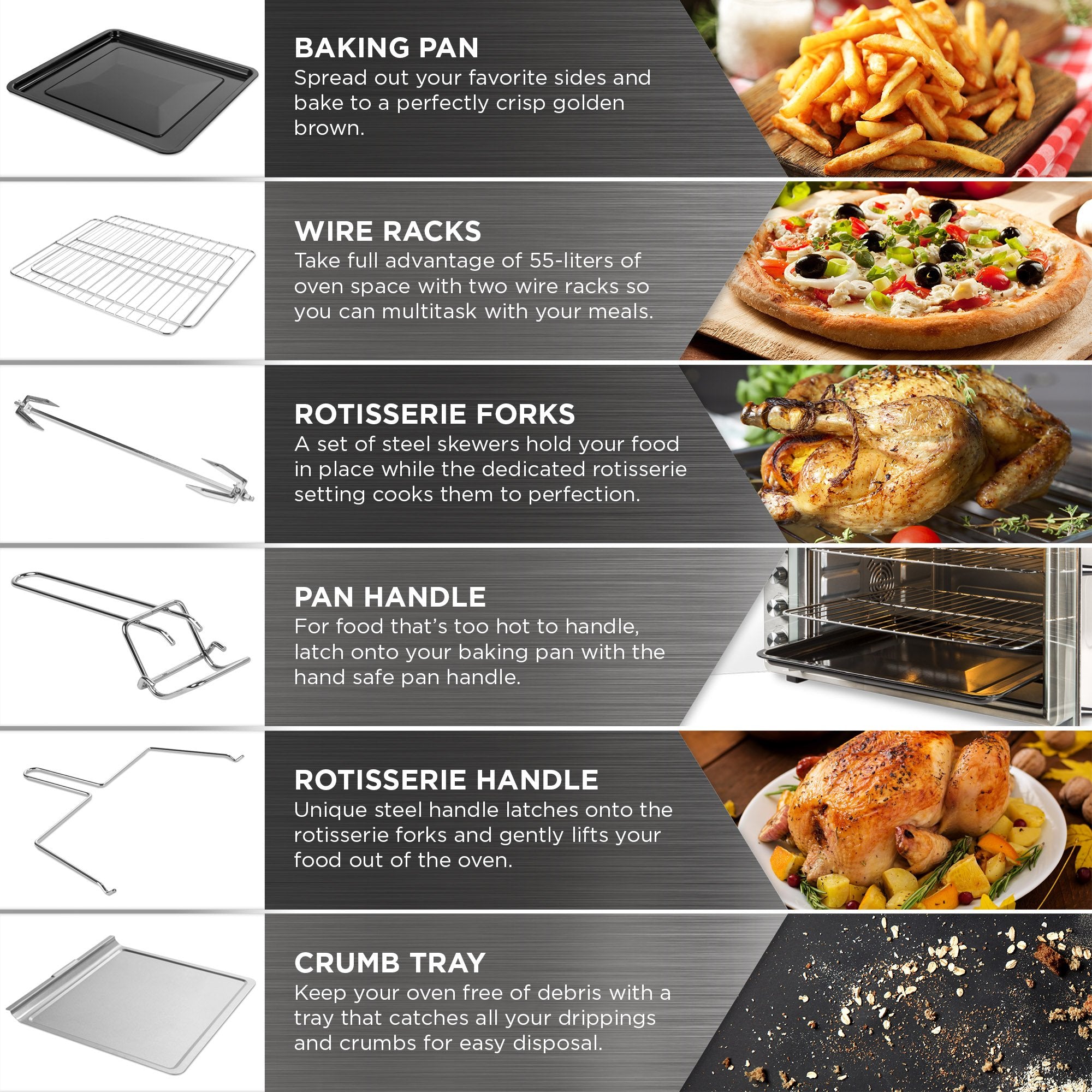 DEDICATED ACCESSORIES: Create delicious meals with convenient accessories; includes a rotisserie handle, rotisserie forks, wire racks, baking pan, a crumb tray, and even a pan handle to lift out sizzling fajitas