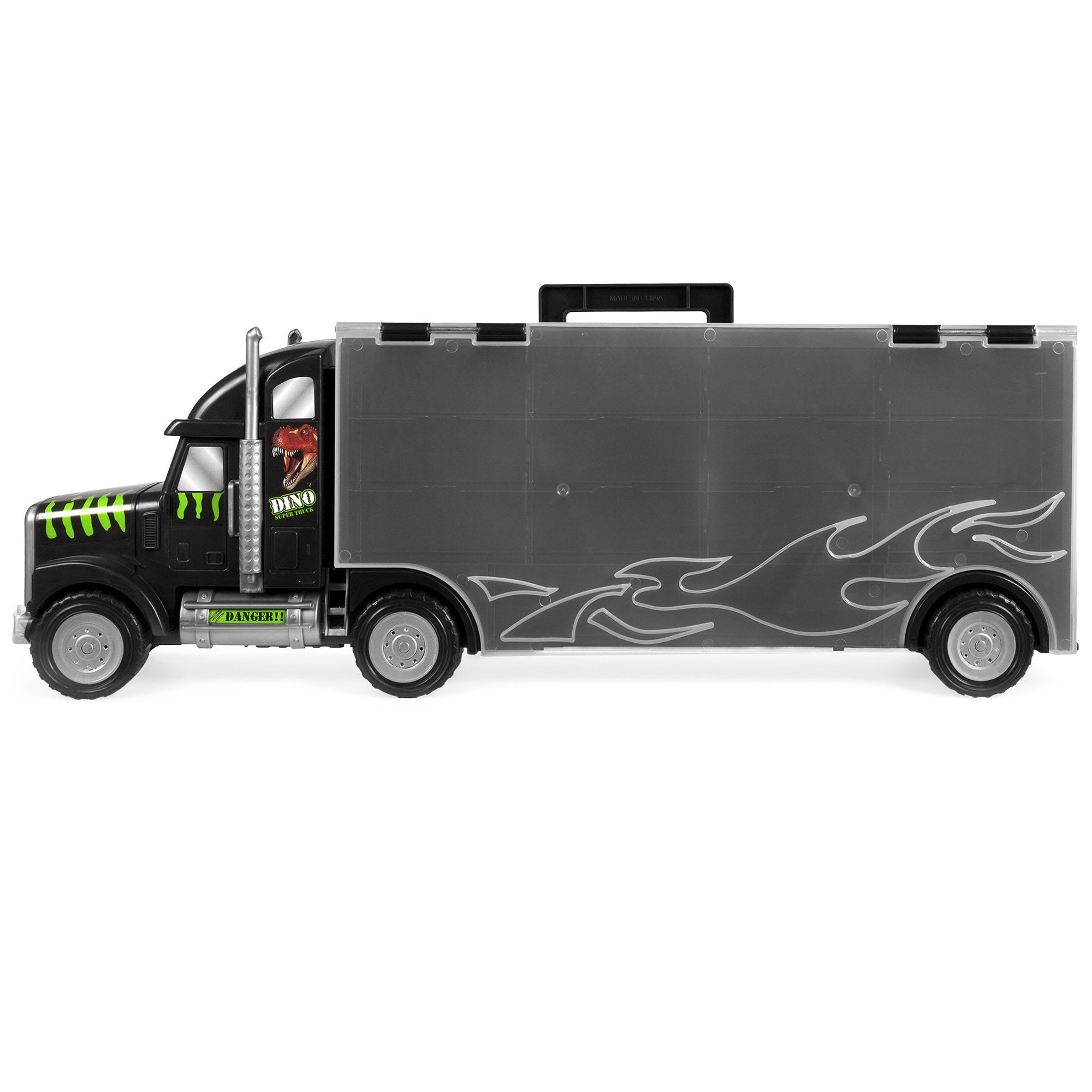 AMPLE STORAGE: Never run out of space, as this truck's carrier fits most toy car brands and has enough room hold up to 28 cars (14 per side)