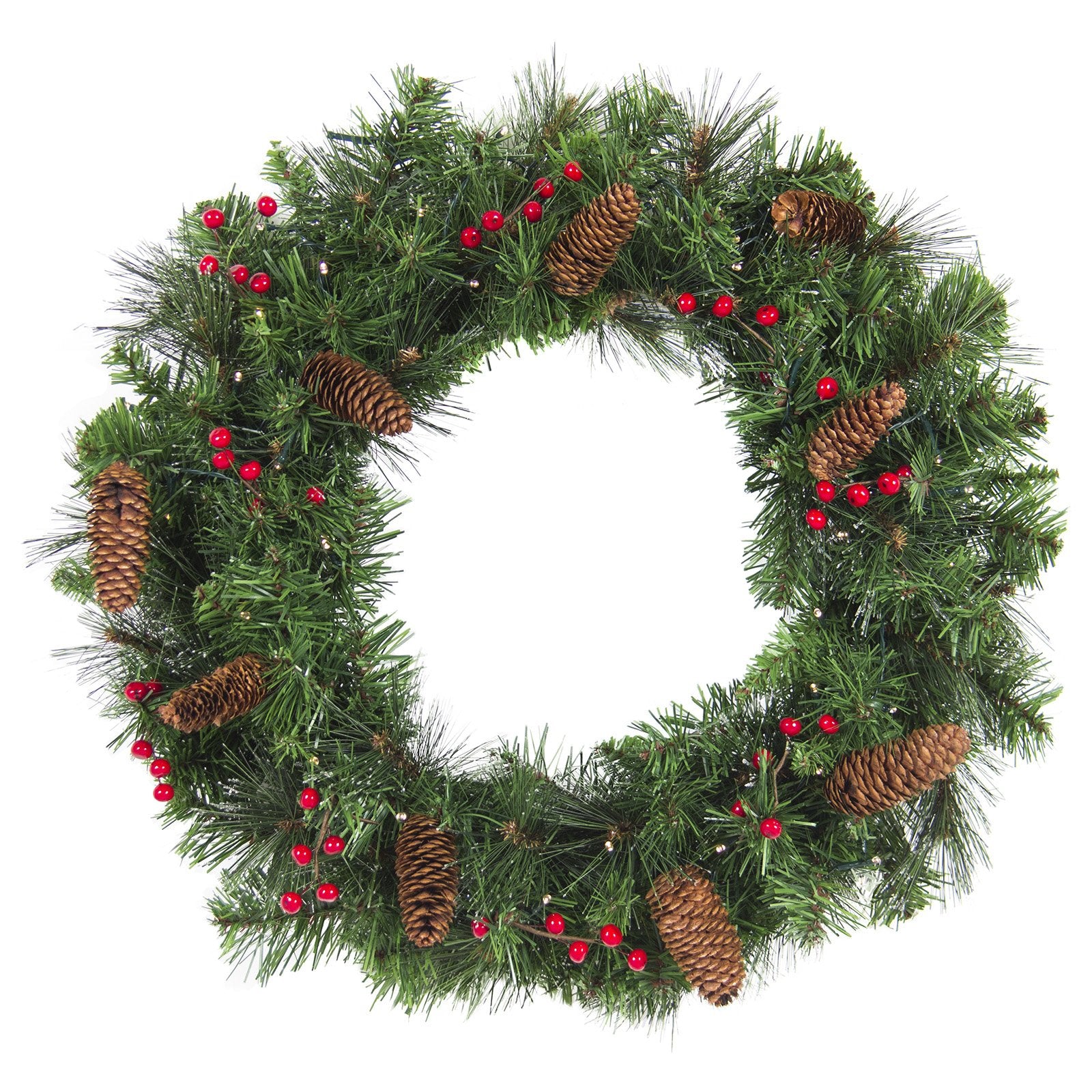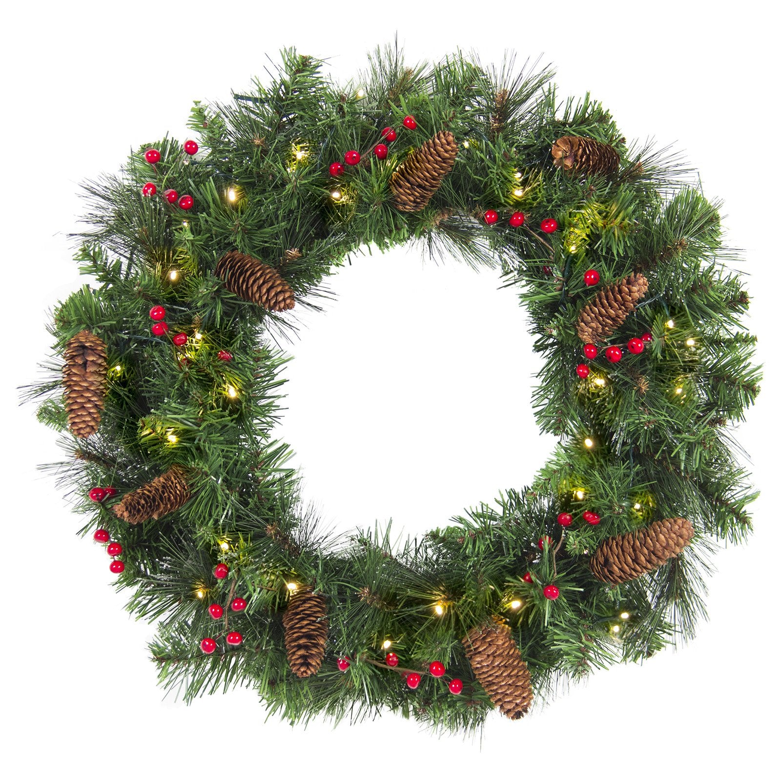 24in Pre-Lit 50 Light Spruce Christmas Wreath w/ Pine Cones, Berries