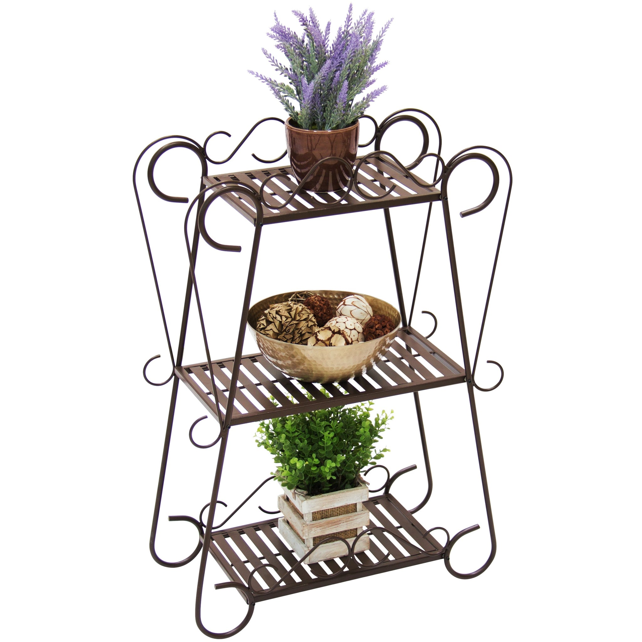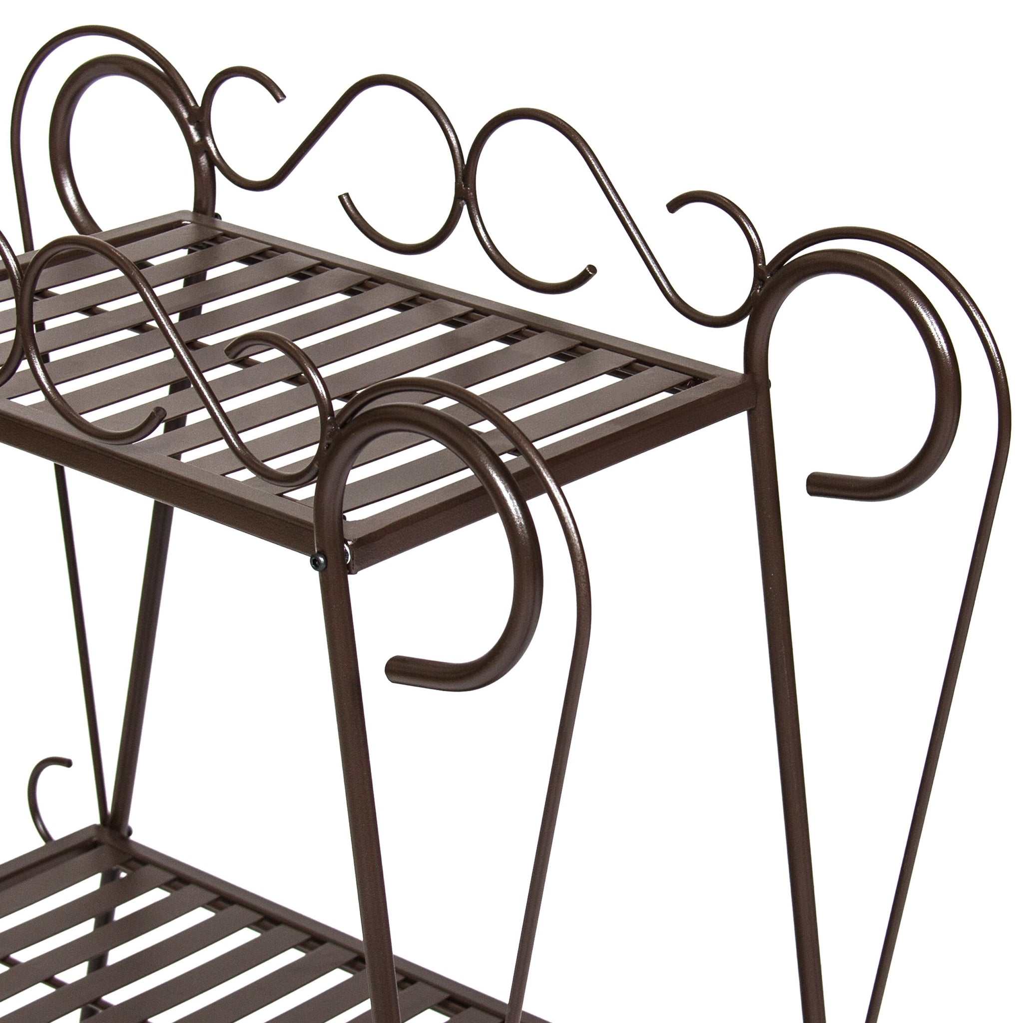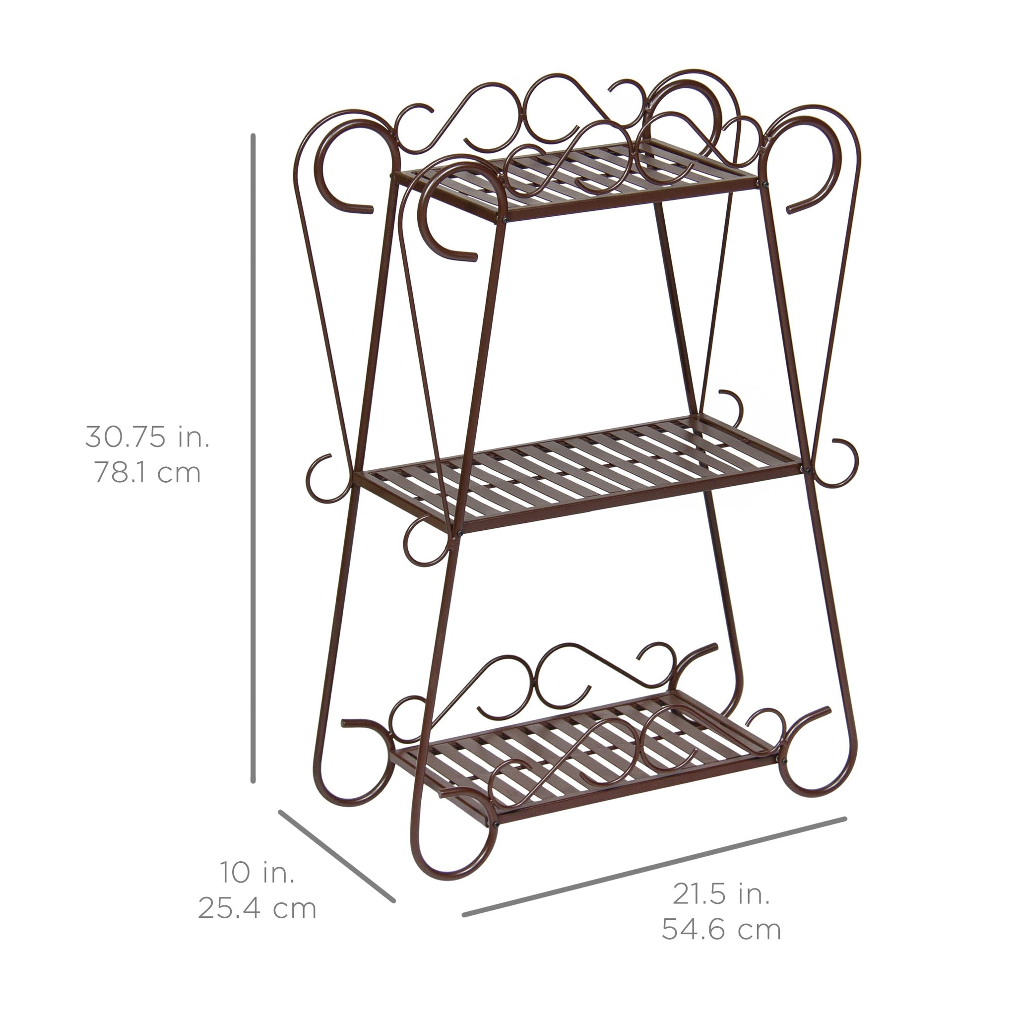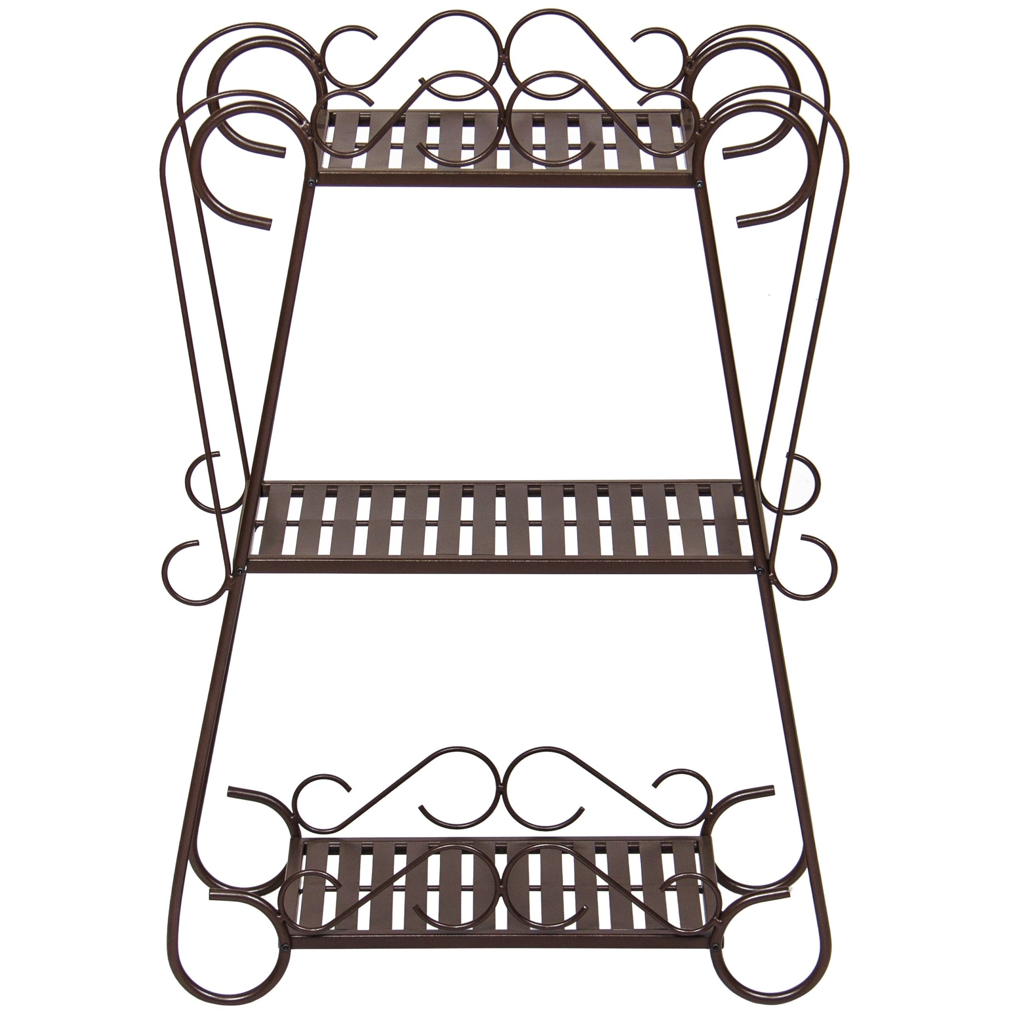 Sturdy 3-tier frame with elegant scroll accents and slatted platforms can hold pots and other decor