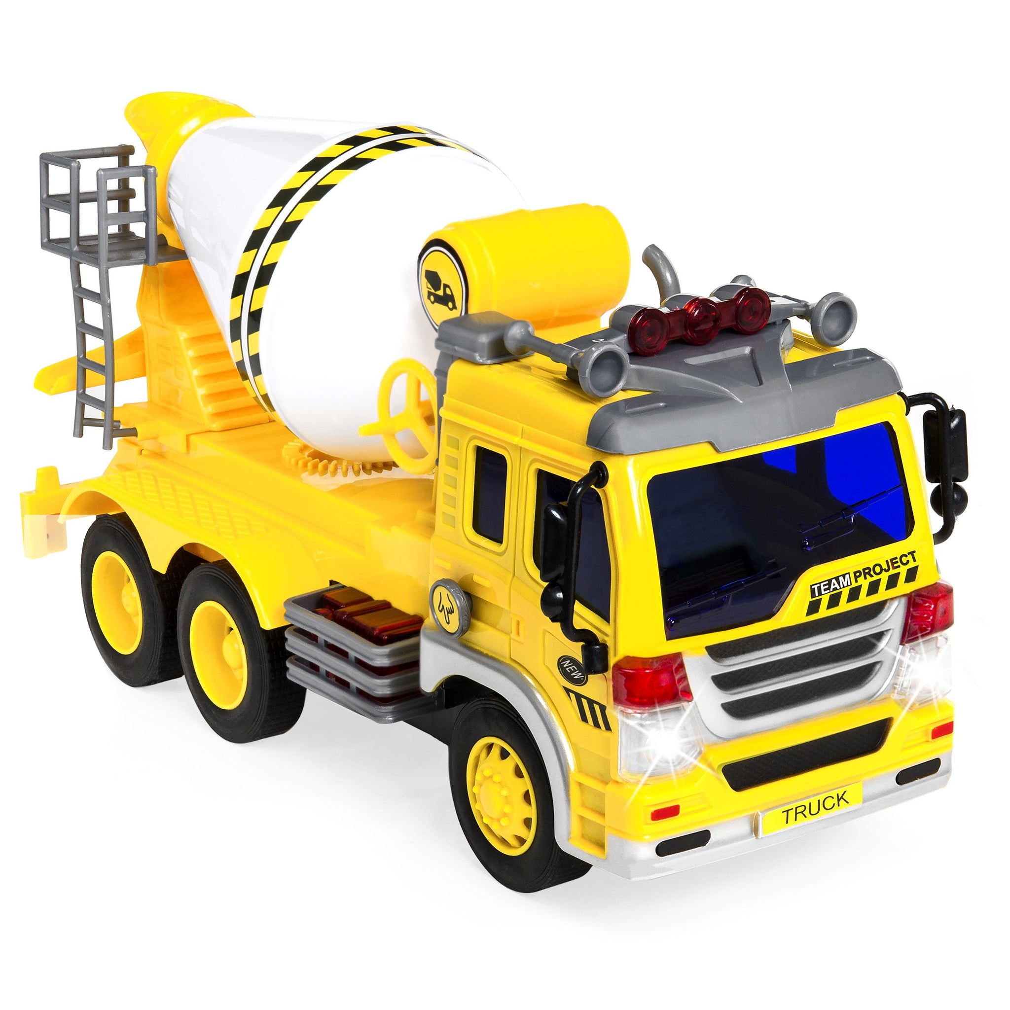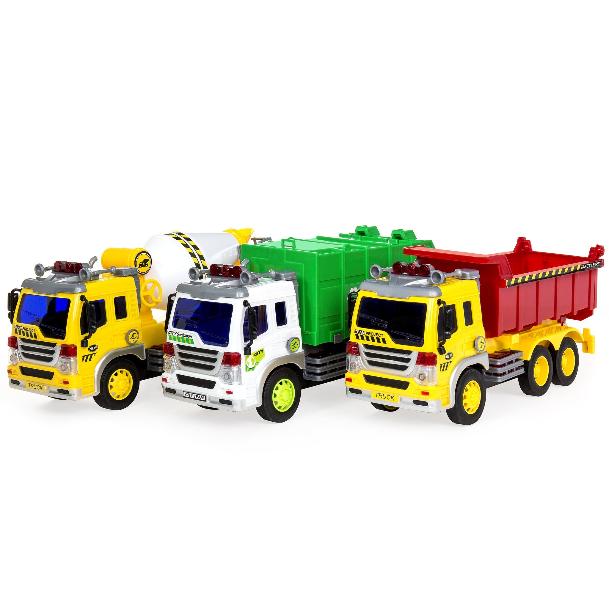 • 1/16 SCALE, FRICTION-POWERED TRUCKS: Give them a rolling start and put them down to go on their own with the friction motor! Each has functional parts like a spinning mixer and a moving dump bed