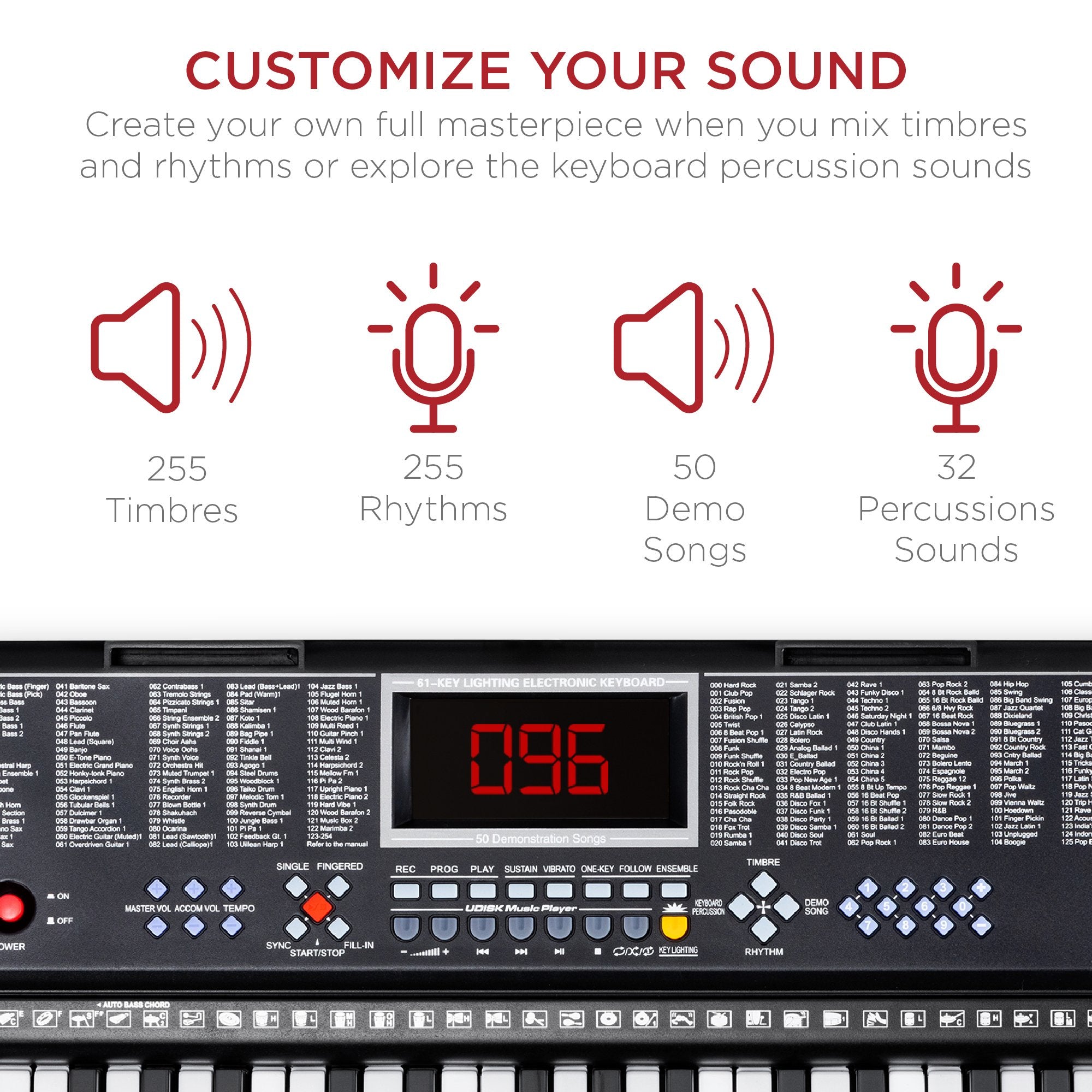 STANDARD SIZE ELECTRONIC KEYBOARD: Complete with 61 keys, 255 timbres, 255 rhythms, 50 demo songs, and 8 types of keyboard percussion to create versatile, quality music