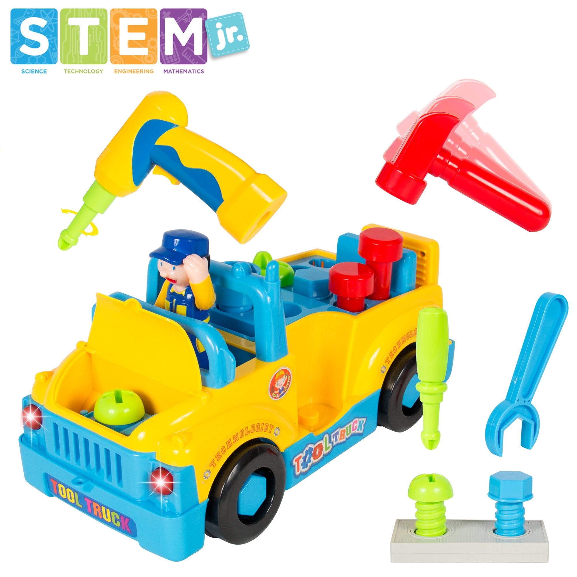 • COMPLETE TRUCK SET: Fun and colorful toy truck comes with an electric toy drill (with 2 attachable tool heads), 3 hand tools, 7 hexagonal/cross screws and nails, a truck driver, and 4 removable wheels