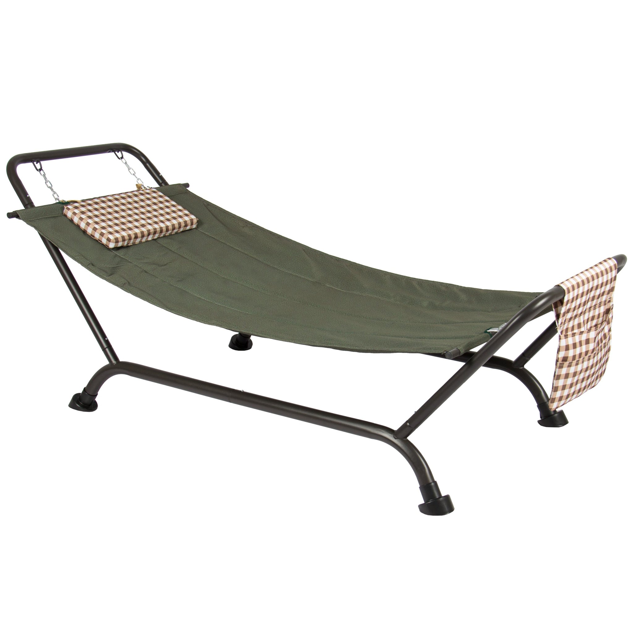 EXTENDED RELAXATION: Comfort and convenience are at your fingertips, as the hammock includes a grid pattern pillow and magazine bag for easy access to your next read
