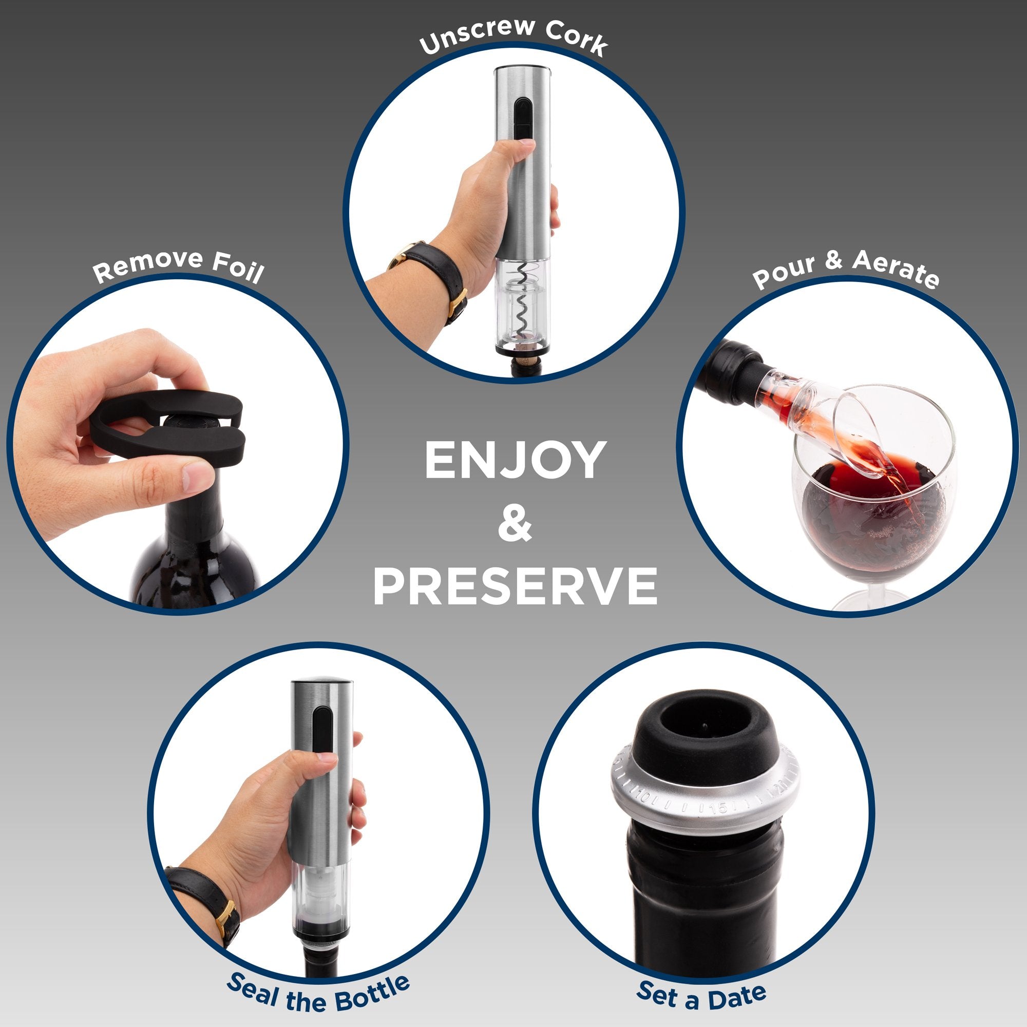 WINE STOPPERS AND PRESERVER: Attain airtight sealing with an included stopper, then preserve your wine using the vacuum system to remove air from the bottle. A date indicator on the stopper keeps track of when the bottle was opened.