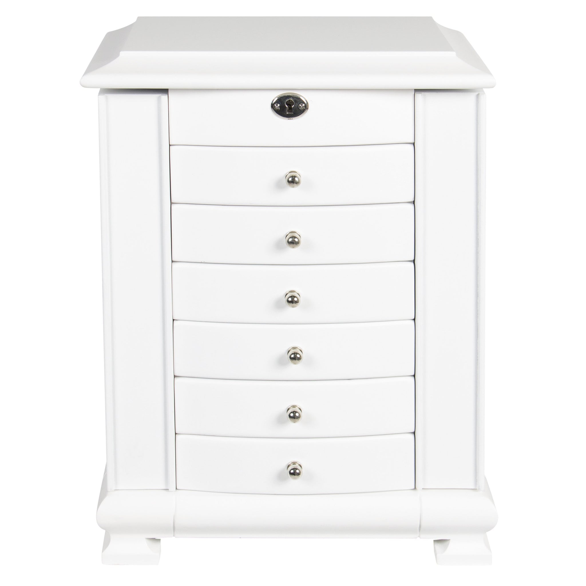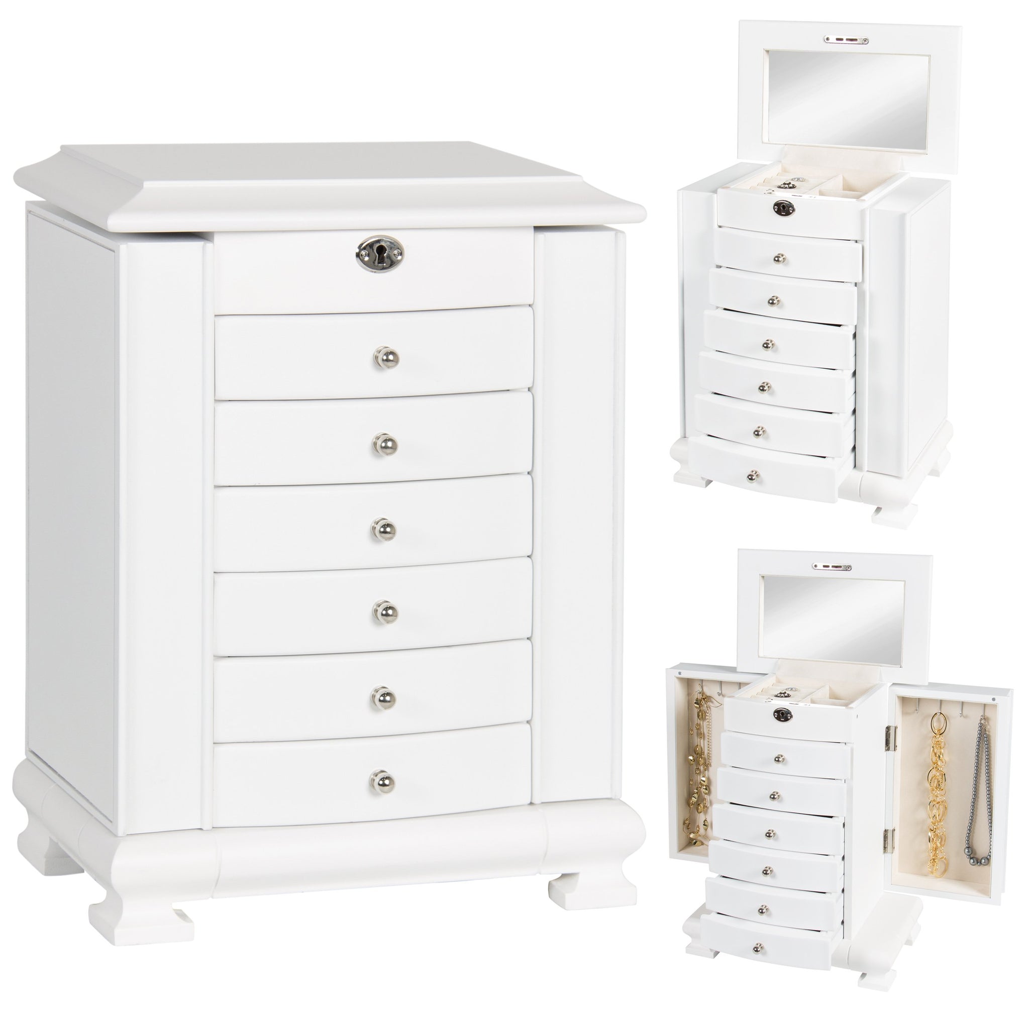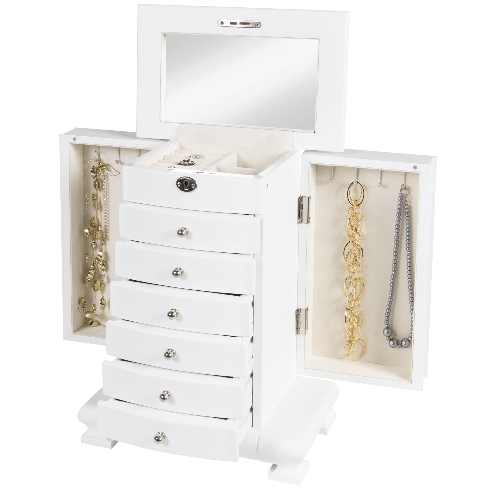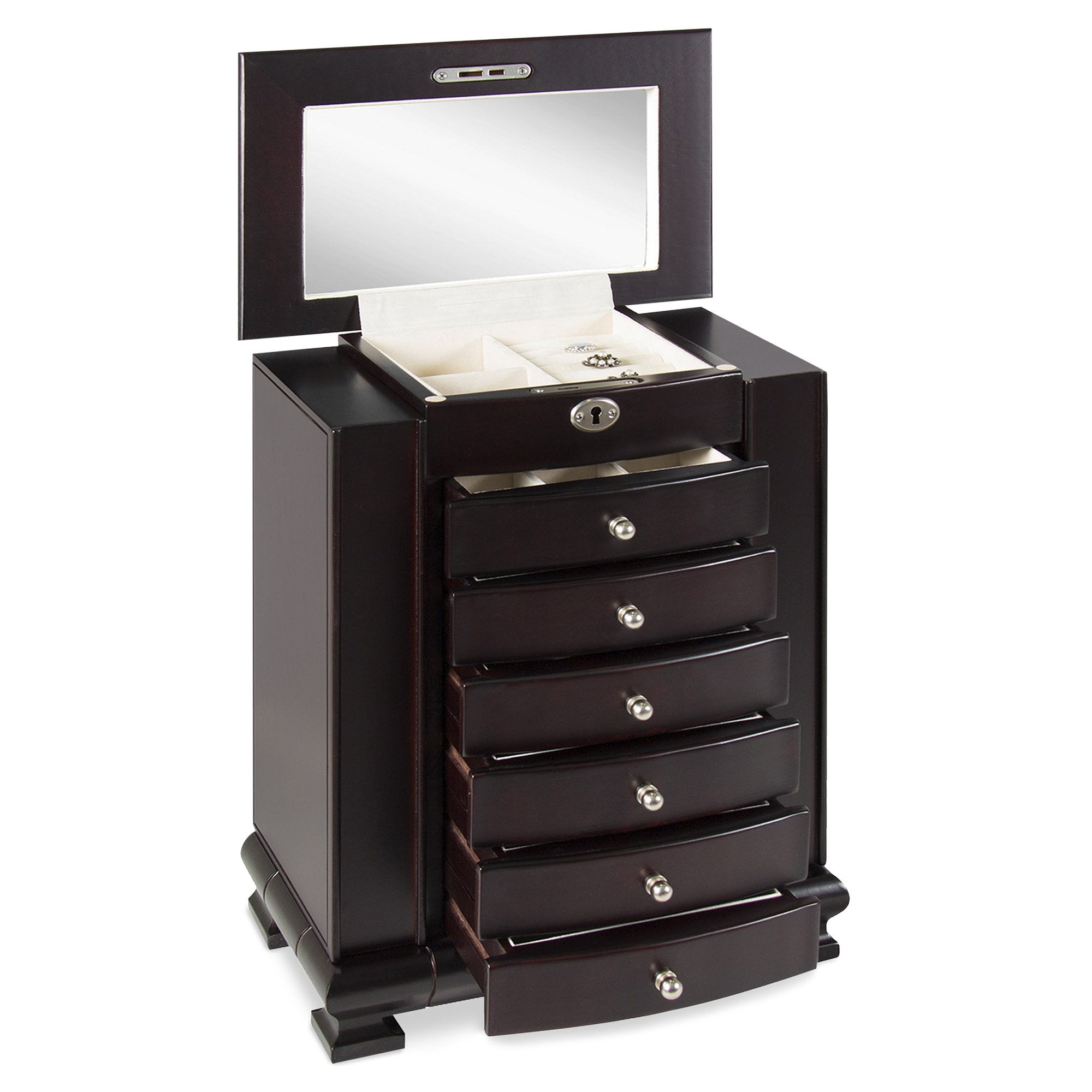 • SPECIALIZED STORAGE: 5 crafted wood drawers, 2 side compartments, and a compartment drawer contain 4 hooks for necklaces and bracelets, ring cushions, a lock to keep jewelry safe, and a mirror