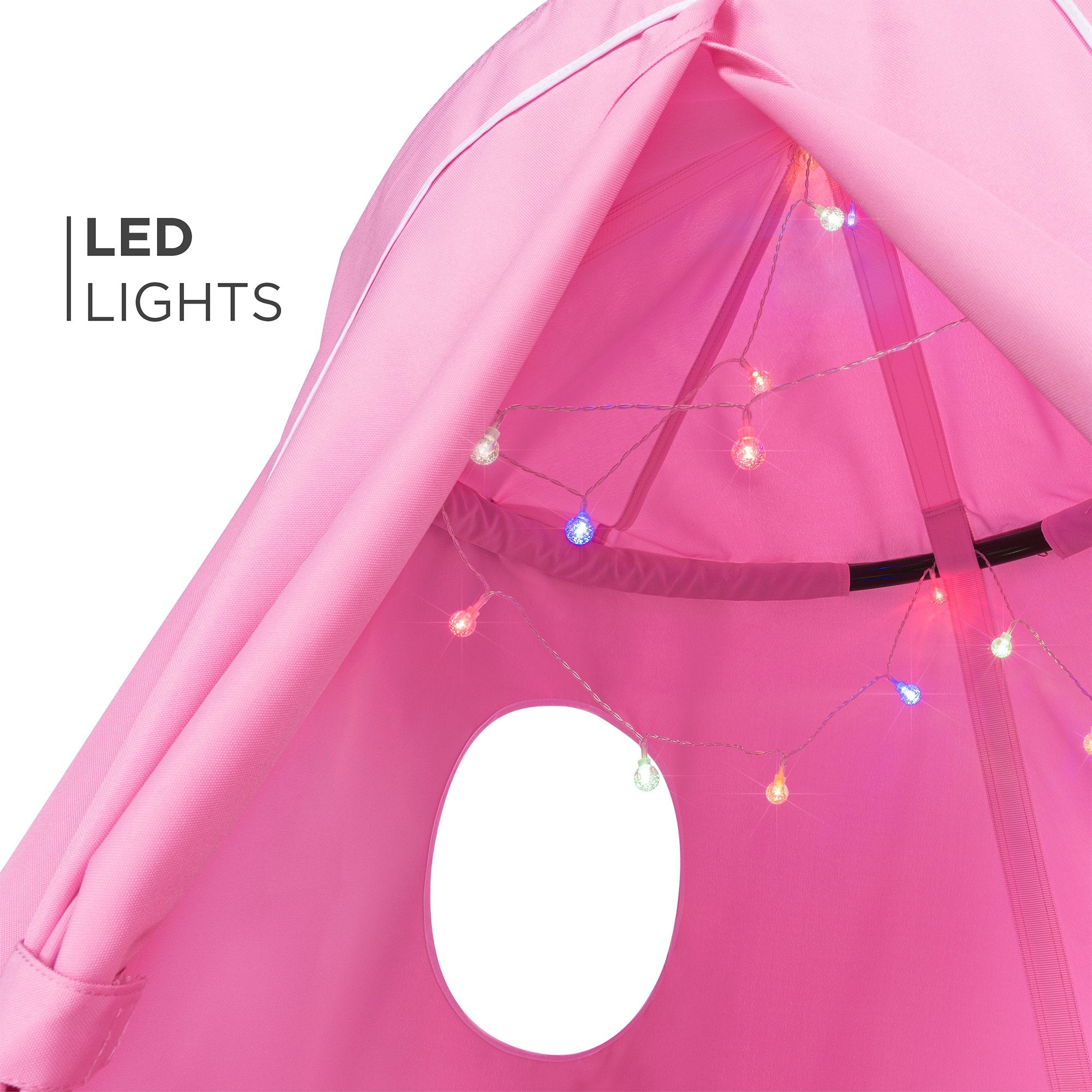 STRING LIGHTS INCLUDED: Red, blue, green, and yellow LED lights are battery-powered and hang from within the tent for children to enjoy playing with toys, or reading during the day or night
