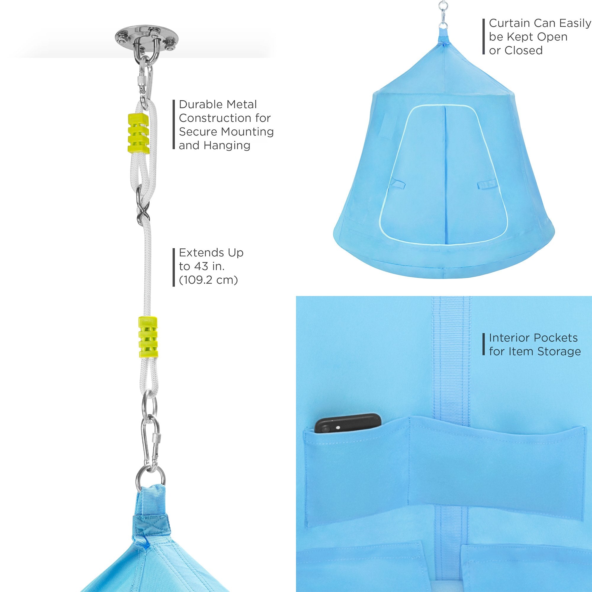 STURDY AND ADJUSTABLE: Included metal ceiling mount piece and adjustable rope keeps it sturdy whether indoors or out-, allowing kids to lounge safely and at their preferred height
