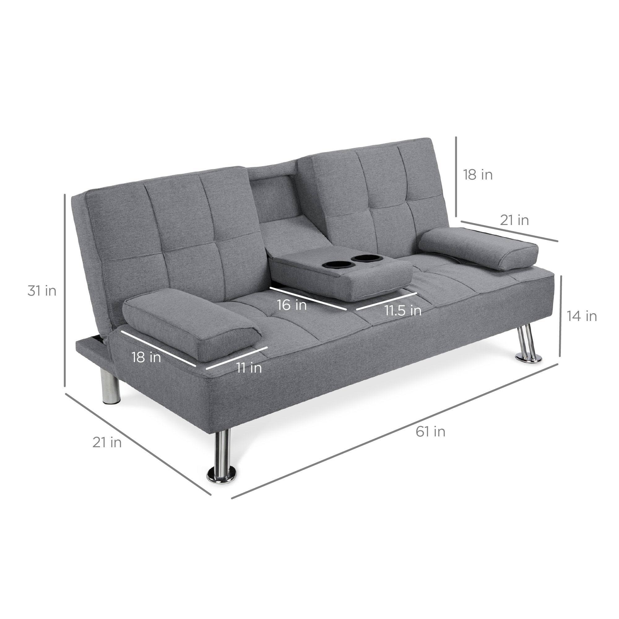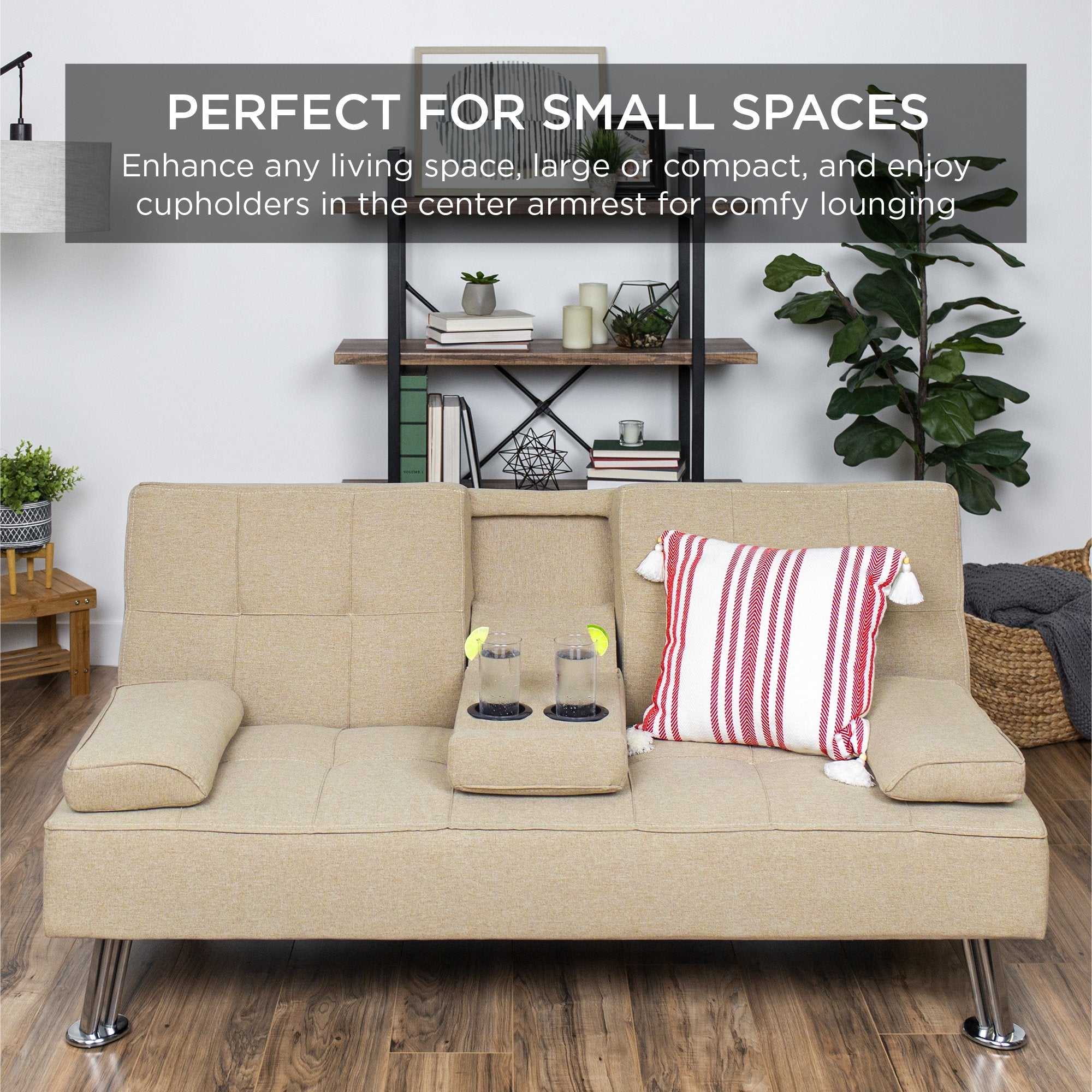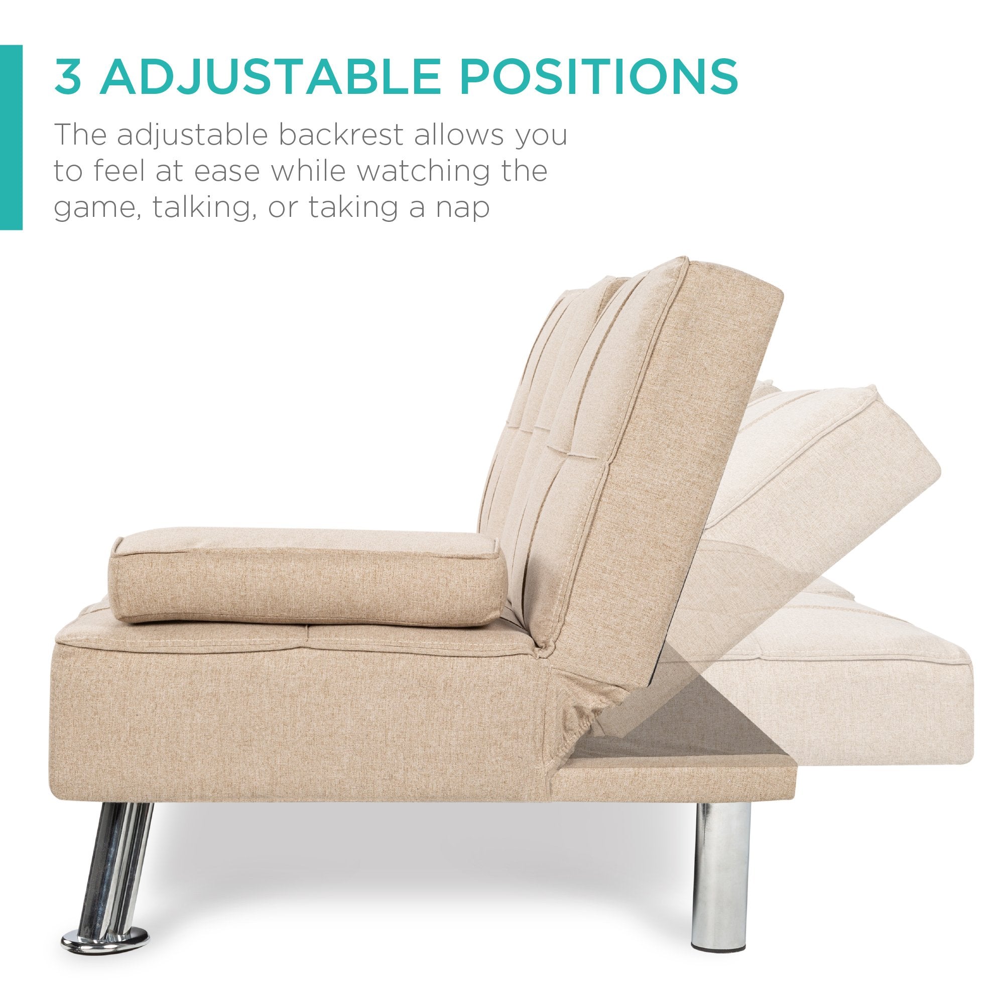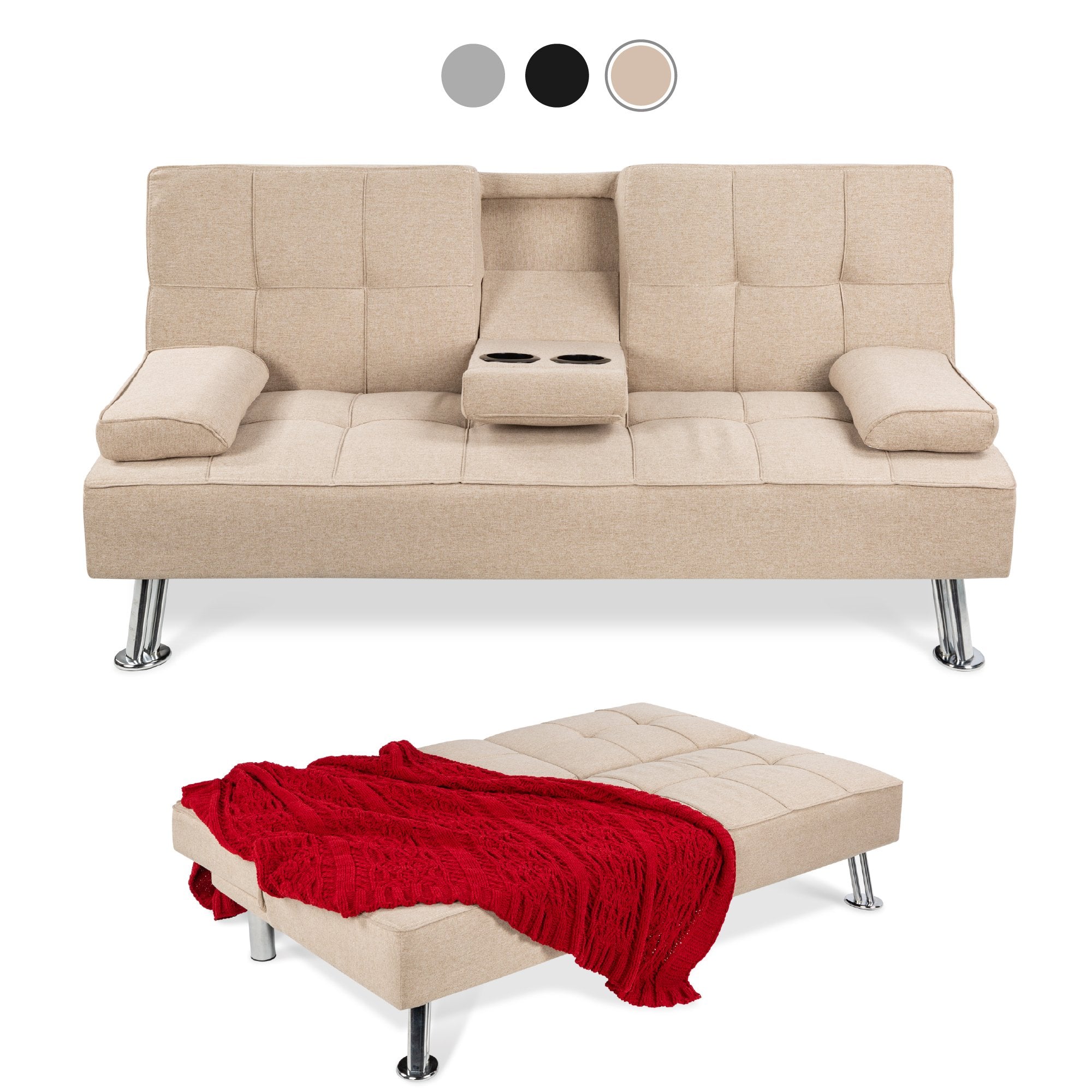 Linen Upholstered Convertible Sofa Bed Futon w/ 2 Cupholders