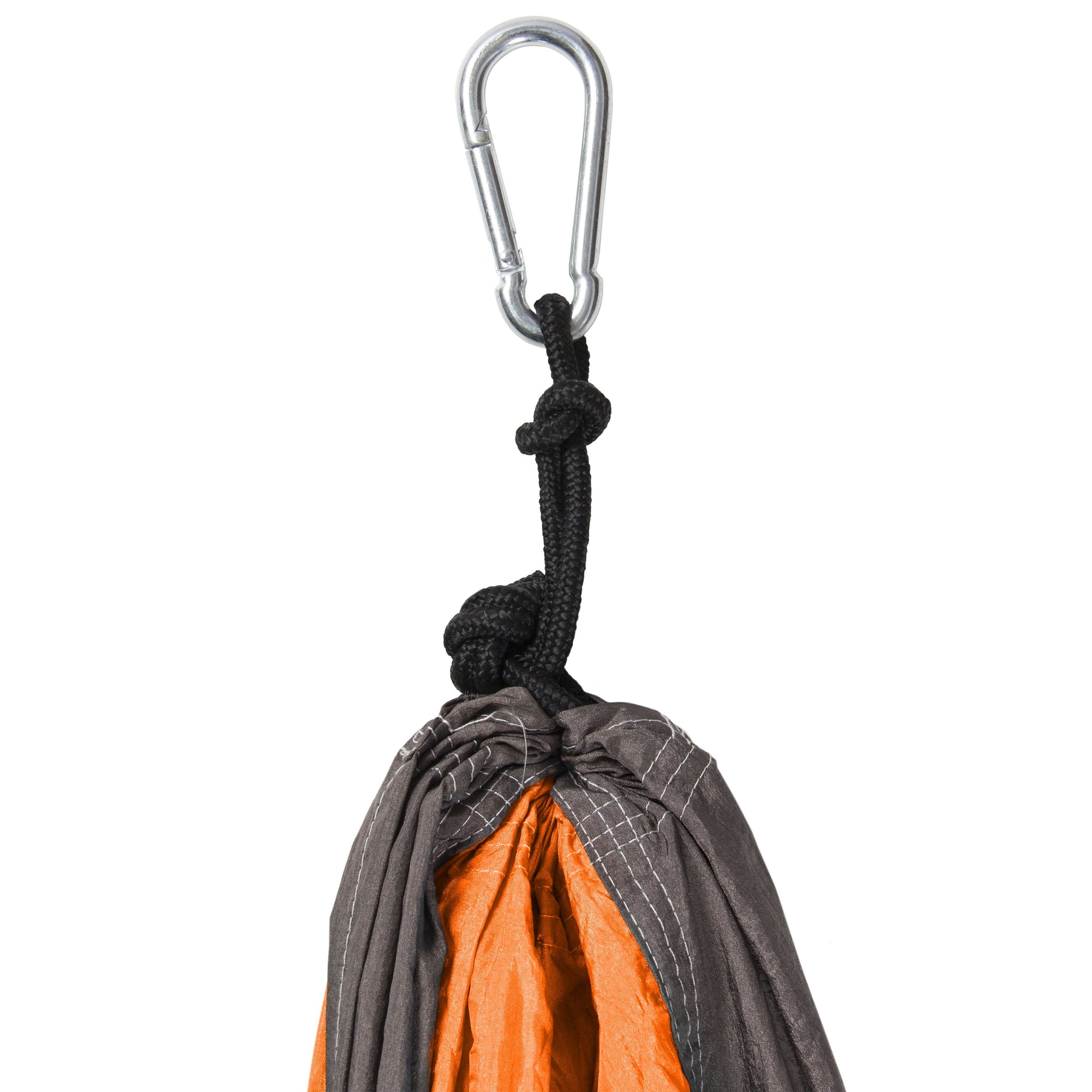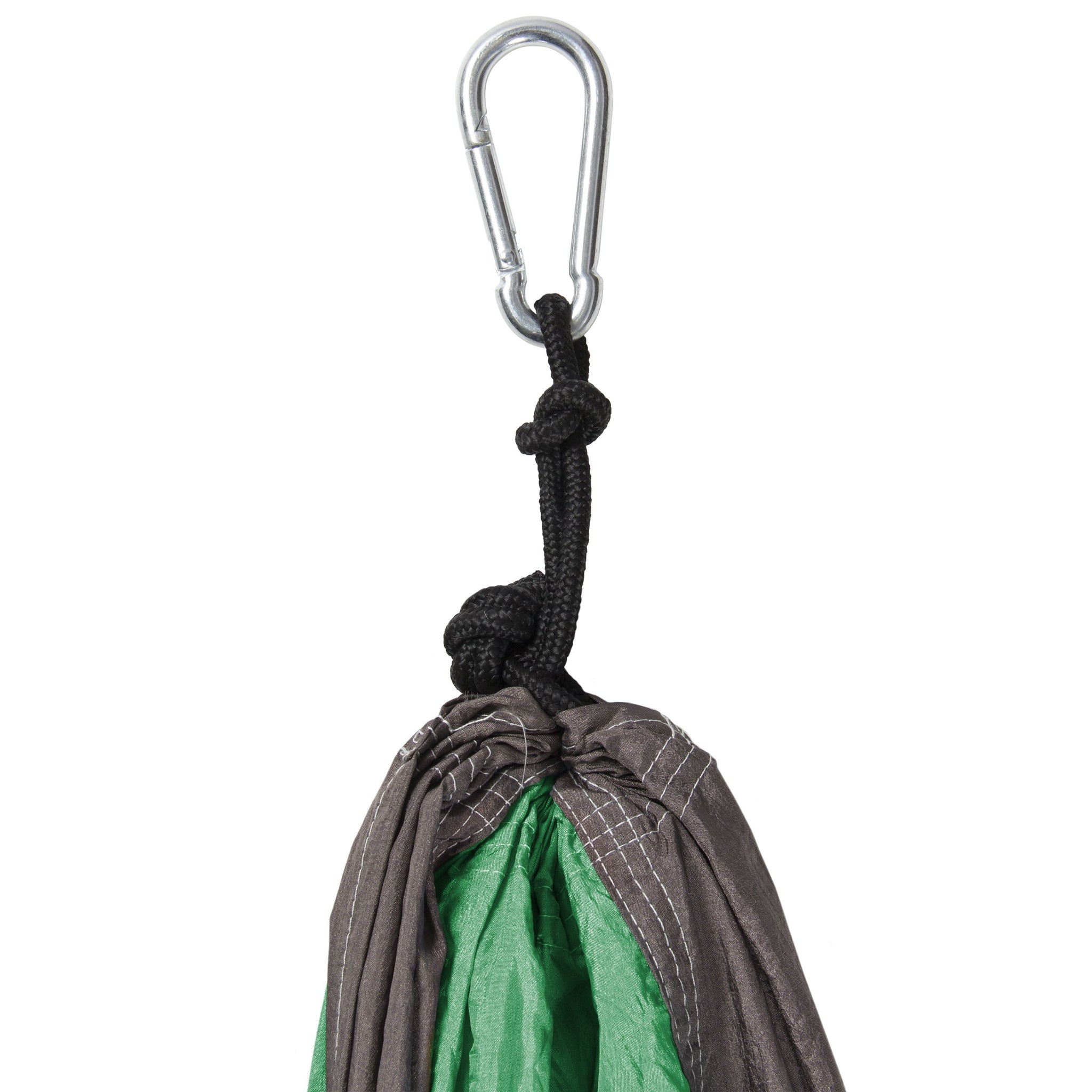 Hangs on a tree line or on a stand with secure carabiners on the ends, great for camping and other outdoor activities