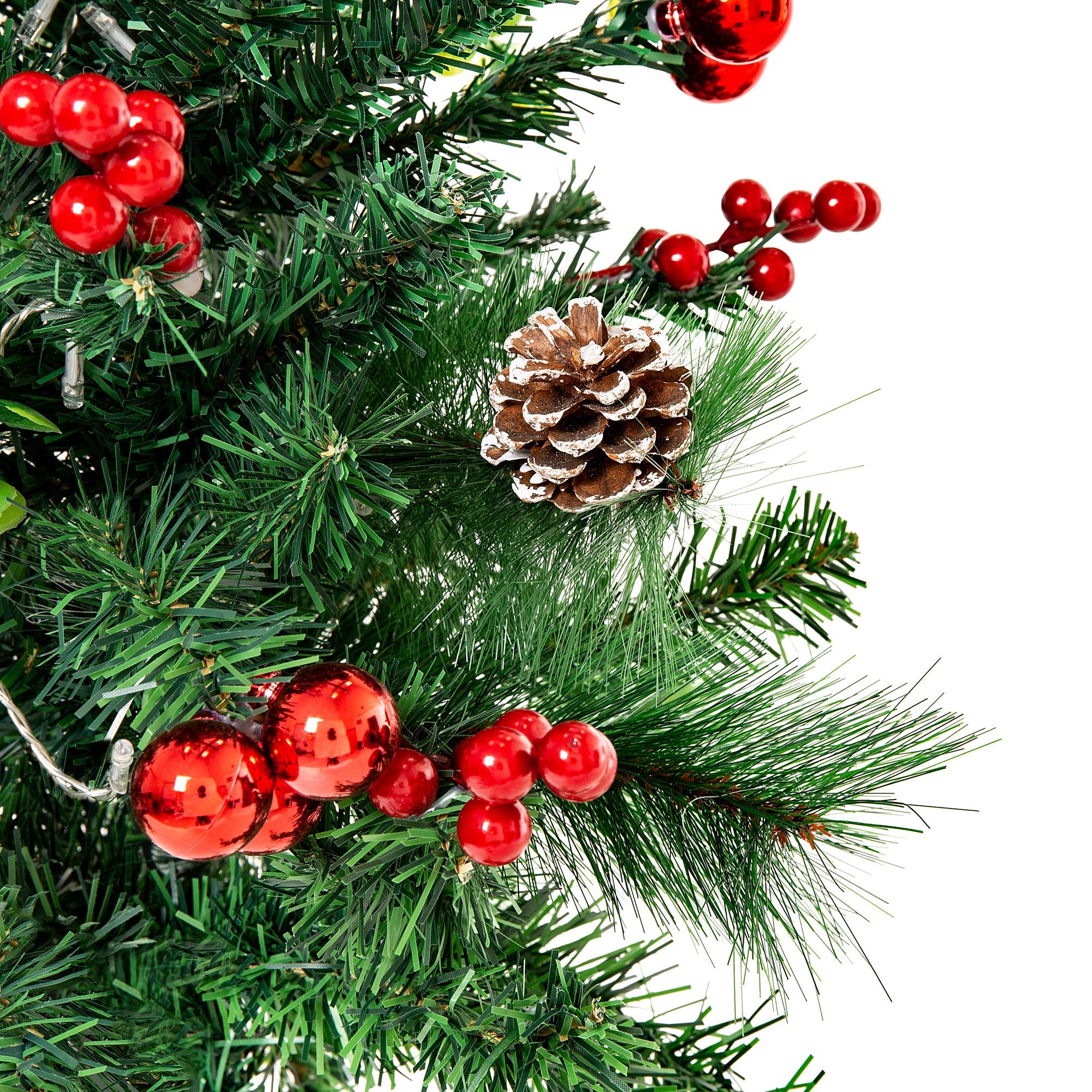 • LUSH AND LIFELIKE: Rich green artificial leaves can fluff in just 10-15 minutes and are accented with lightly frosted pinecones, berries, tendrils, and glimmering red ornaments for a lively feel